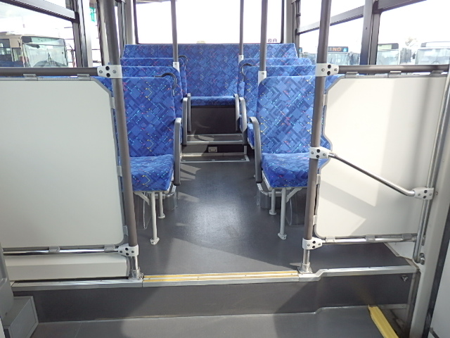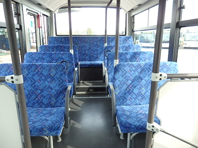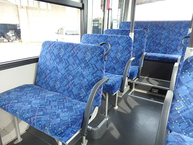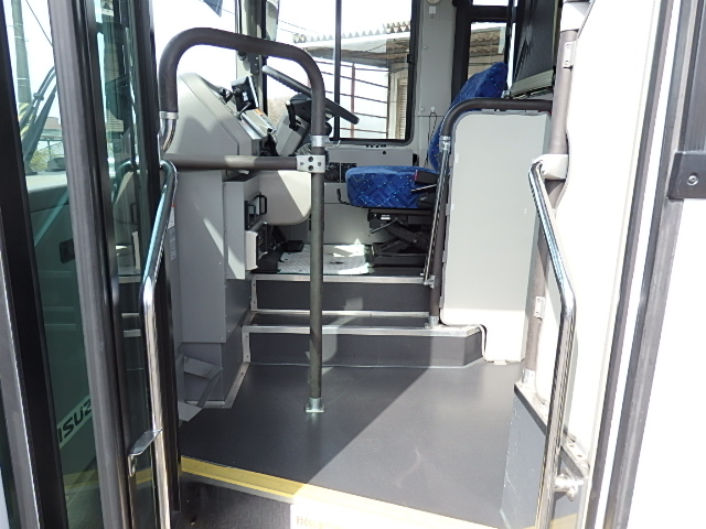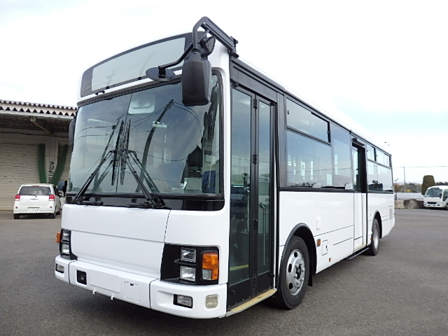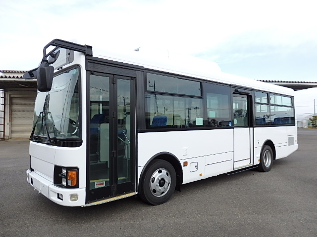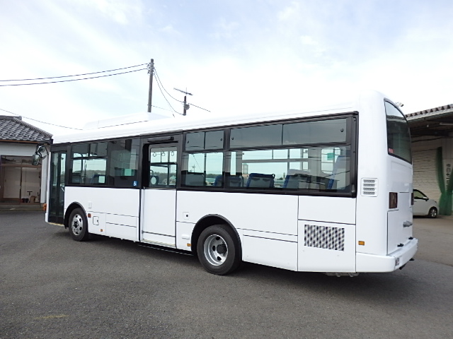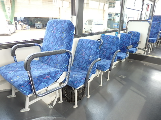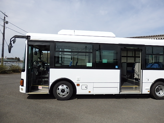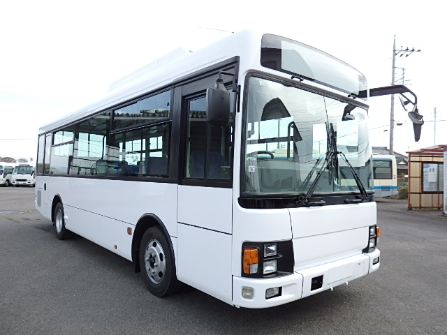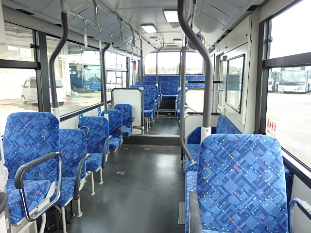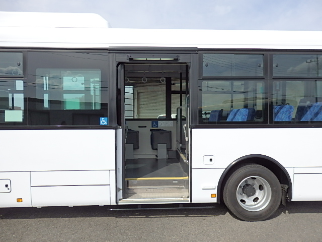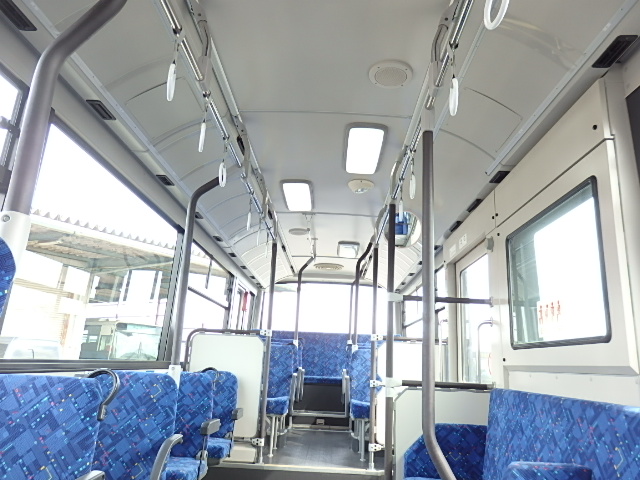 中型路線仕様・ワンステップ式 シフト・6MT ニーリング装置装着 定員・60名*(正座席・27名+D席・1名+立席・32名)*シートレイアウト・路線バス仕様 バリアーフリー適合車 車椅子用スロープ板(中扉・床部収納式) エアコン・DESNO製 ヒーター・温水式 降車ボタン・なし バックアイカメラ・カラー液晶モニター 換気扇・2基  タイヤ状態:夏用ラジアルタイヤ・6本・50% 塗装状態:白1色*(全塗装施工実施済)